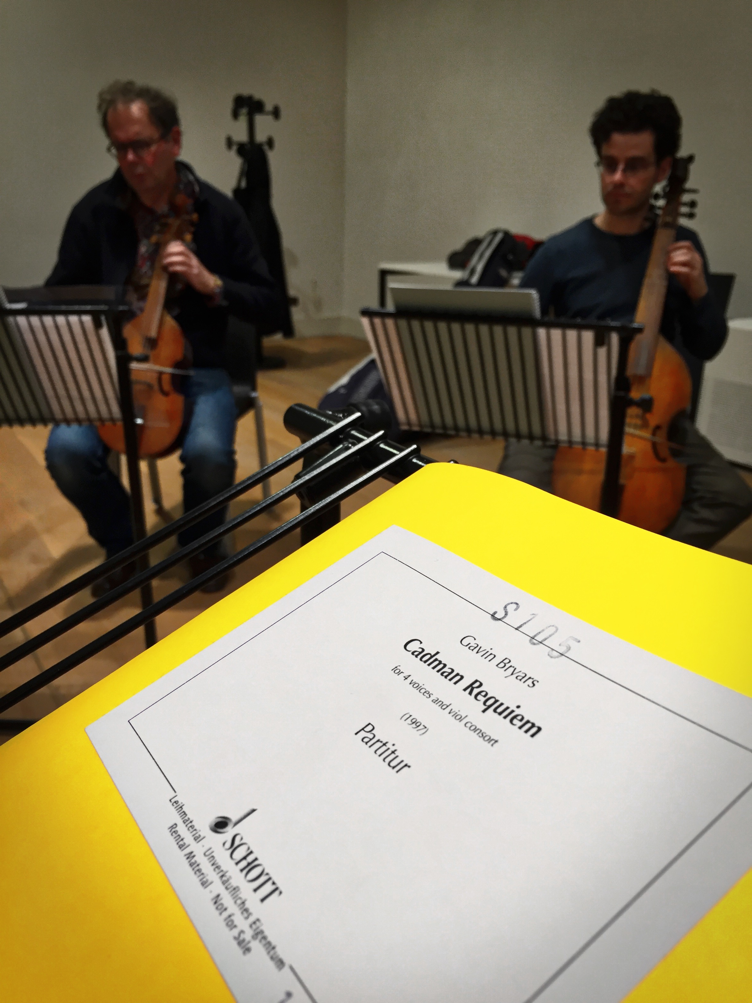 We hebben natuurlijk al duchtig gerepeteerd, en inmiddels is ook The Spirit of Gambo in België aangekomen. Het worden concerten ‘met stip’ — dat staat vast. Met Cadman Requiem in het midden is er voor en na zesstemmige consort-muziek te horen (Taverner en Gibbons) en twee reusachtige Perotinus-stukken (ca. 1200) in vierstemmig organum. Als kersen op de taart weerklinkt eerst ook nog het gregoriaanse Requiem en aan het eind het In Paradisum. Een pluim en een dankjewel voor professor Pieter Bergé, die het concept van dit concert uitdacht. En een dikke dankjewel aan Freek Borstlap en Thomas Baeté en de andere leden van The Spirit of Gambo die er zo enthousiast in mee stapten. Bij Psallentes zijn voor deze gelegenheid te horen: Rob Cuppens, Jan Caals, Jan Van Elsacker, Greg Skidmore, Laurens-Alexander Wyns, Michiel Haspeslagh, Pieter Coene, Pieter Stas en Hendrik Vanden Abeele.