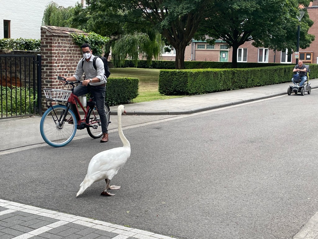 Onlangs kwamen we op straat in Leuven een zwaan tegen. Het arme dier was de weg kwijt, denken we. Het slofte niettemin (ogenschijnlijk) rustig over straat. Midden op de straat. Er zijn weinig gebeurtenissen die zo op het verkeer ingrijpen: iedereen stopt, om te kijken of uit voorzichtigheid.