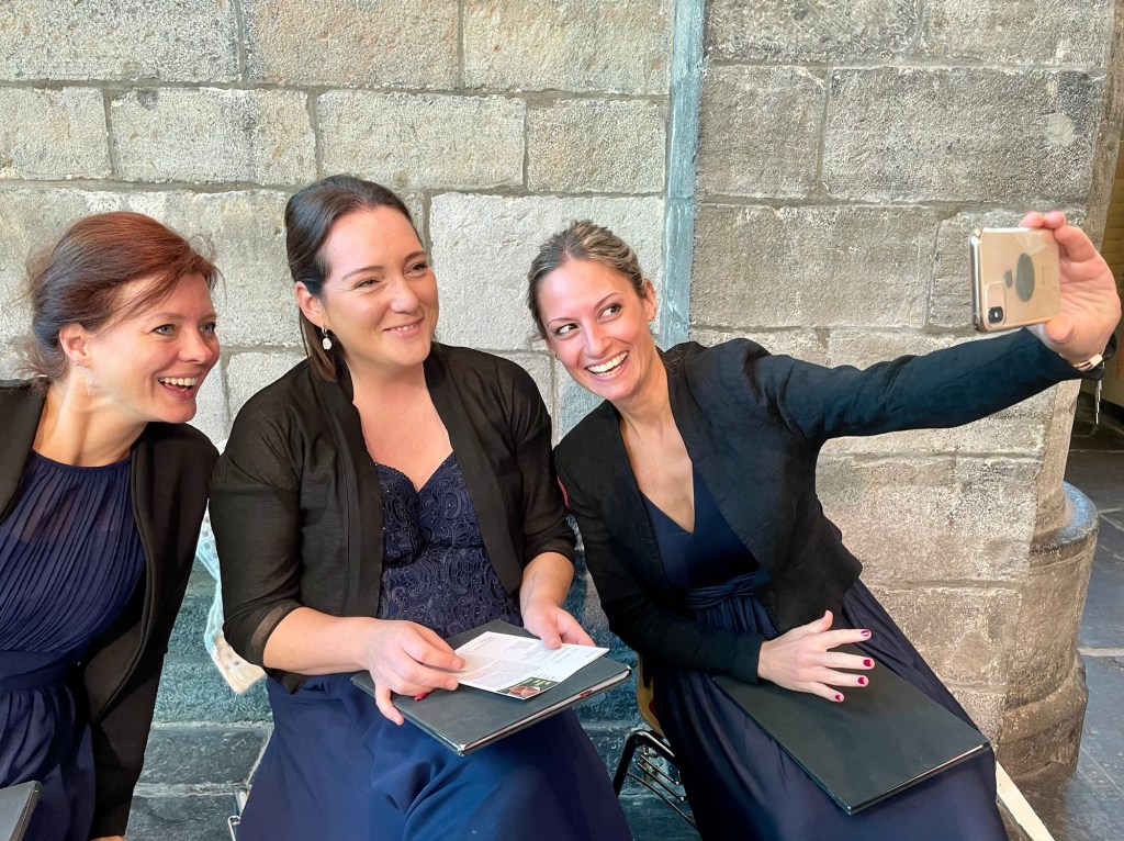 Over een weekendje Maastricht hoeven we bij Psallentes niet te twijfelen. De mooie stad aan de Maas is altijd erg gastvrij geweest voor ons, en dat was deze zondag niet anders. In de Sint-Janskerk leverden we deze ochtend onze muzikale bijdrage aan de protestantse eredienst. Dat gebeurde met zowat de kleinst denkbare Psallentes-bezetting: een trio. Sarah Van Mol was erbij, en ook Elisabeth Colson, en ja daar rechts herken je Kerlijne Van Nevel. Het was nog maar een kleine préambule bij wat we na de middag in de Sint-Servaas zouden doen. Dominee Drost ging overigens uitgebreid in op het thema van het festival Musica Sacra: ‘uit vrije wil’. In Maastricht gaan zingen? Graag!