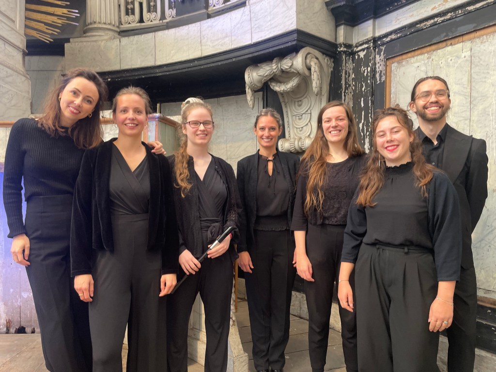 Op de foto van links naar rechts: Lisa De Rijcke, Marie van Luijk, Veronica Samyn (blokfluiten), Kerlijne Van Nevel, Katelijne Malomgré, Clara Dijckmans en Alexander Van Goethem. Proficiat aan deze mooie, jonge ploeg. Het vuur van de oude muziek gaat nog niet snel doven.