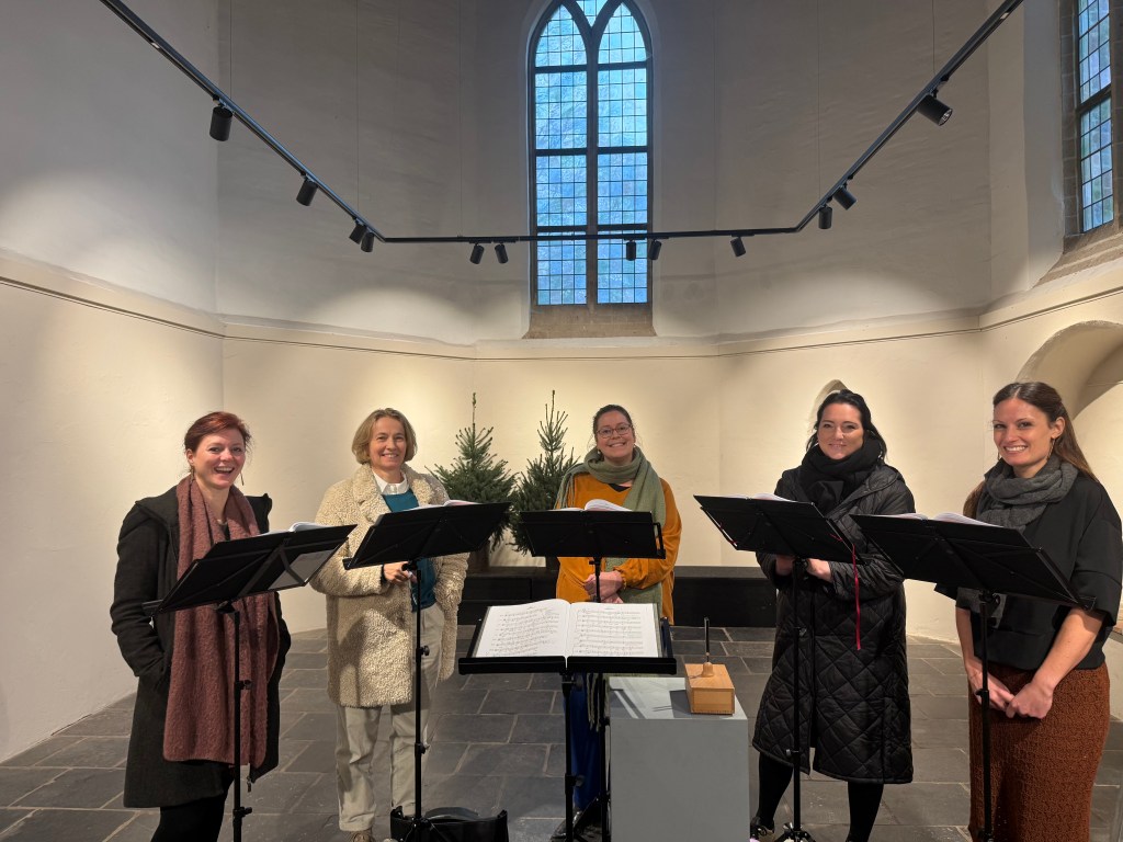 Deze middag waren we te gast in Velp bij Grave, in Nederland. We zongen er in een heel mooi lief oud schattig fijn tof kerkje, de Sint-Vincentius. Dat is een Waalse heilige, en we hadden muziek bij van een Duitse heilige (Hildegard), muziek over een Franse heilige (Bernardus) en muziek op tekst van de Vlaamse Hadewijch. Beste veel regio’s bediend dus! Omdat wegens zwangerschappen en andere besognes een paar vaste Psallentes-waarden afwezig bleven, deden we het met een kleine ploeg. Bijna tachtig minuten muziek met niets dan vijf stemmen – dat maak je niet elke dag mee. Het tevreden publiek bedacht ons met een Staande Ovatie en veel boe-geroep. Sorry – ik bedoel bravo-geroep! De dienstdoenden waren van links naar rechts Zarah Fon Mol, Reenathe Feytjens, Parpara Zomers, Elizabeth Colzon en Kerlaine Fon Nefel. [Oeps: de Hildegard-uitspraak staat nog aan!]